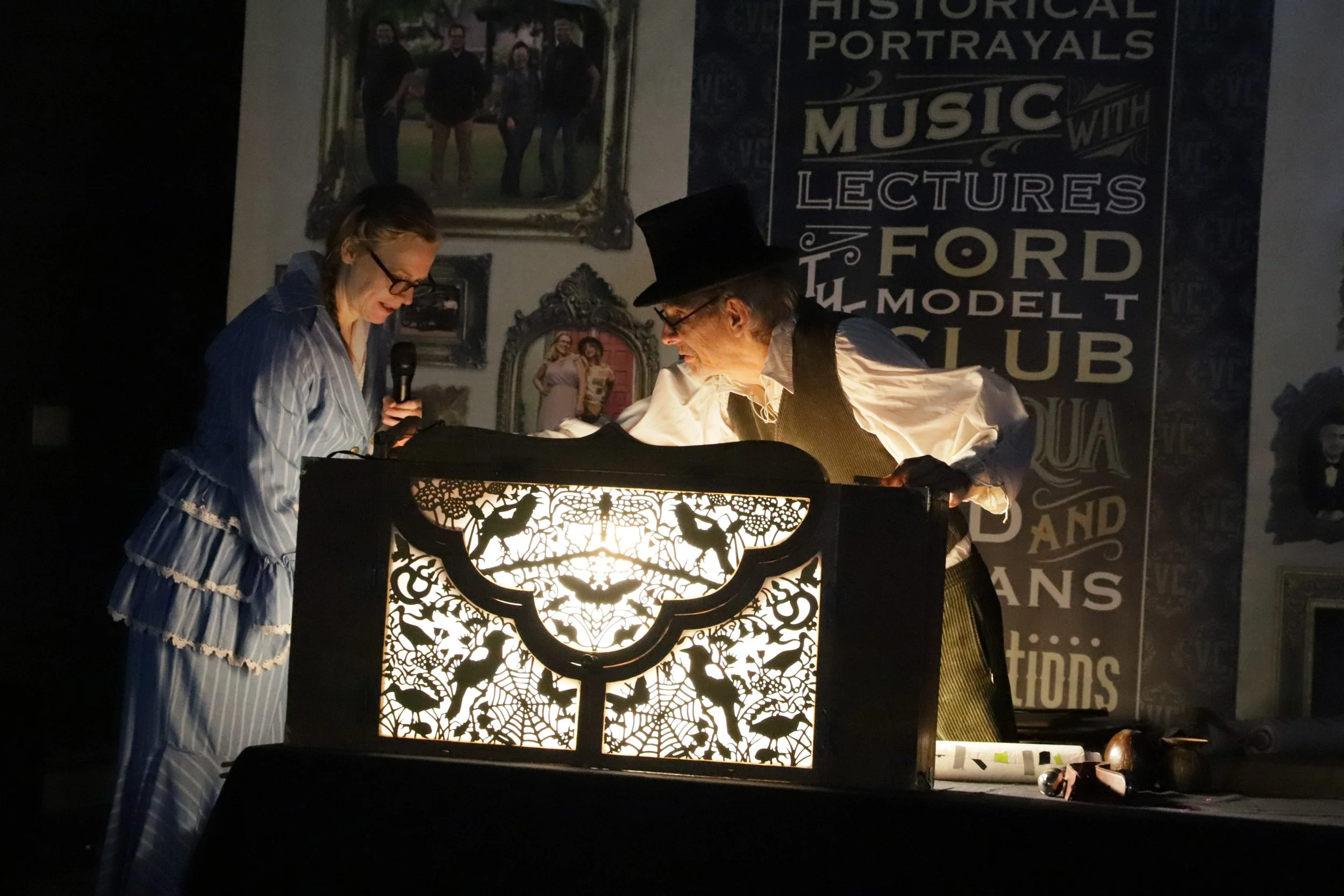 This ancient form of storytelling and entertainment utilizes flat, cut-out figures or shadow puppets, which are held between a source of light and a translucent screen or scrim that faces her audience. The simple mechanics are a wonderful reflection of a bygone era, making her presentation a great addition to the 2022 Victorian Chautauqua. A collection of short stories will make up her program on Saturday, July 9, 2022, and has been generously funded by Jeff and Elizabeth Rees Gilbert and co-funded by the Schlattman Family. While Katherine stands behind her miniature theatre to narrate tales, the audience will watch the illuminated show unfold before them.